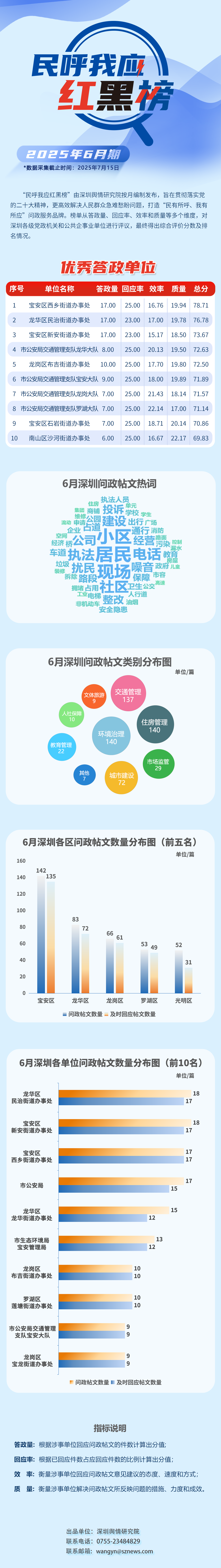 本期榜單采集的帖文主要來(lái)自深圳市及各區(qū)政府官網(wǎng)、深圳論壇、人民網(wǎng)領(lǐng)導(dǎo)留言板、深圳新聞網(wǎng)“民呼我應(yīng)”等平臺(tái),所采集帖文發(fā)布時(shí)間為2025年6月1日至6月30日,采集截止時(shí)間為2025年7月15日。
