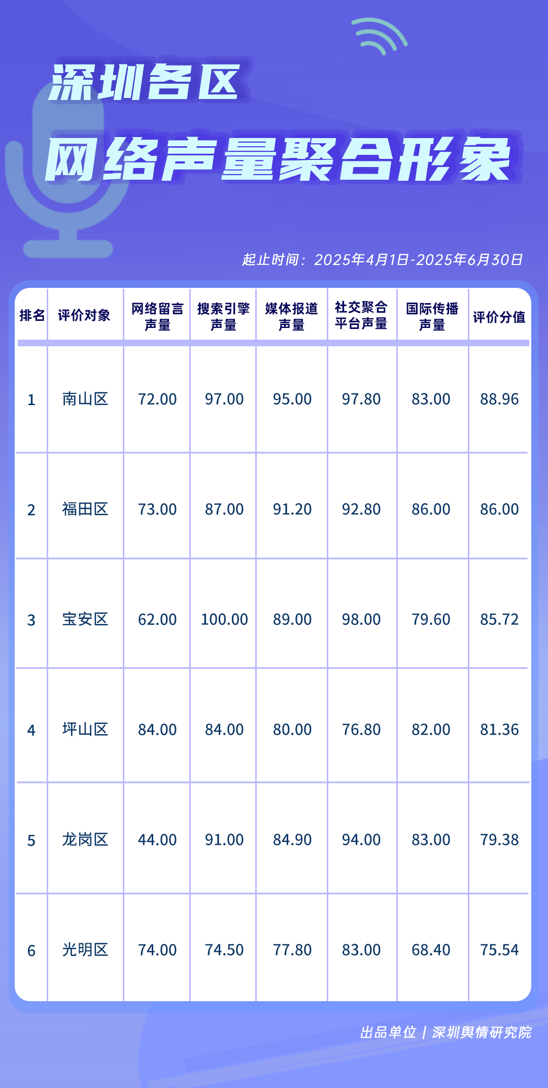 4-6月,《深圳各區(qū)網(wǎng)絡(luò)聲量聚合形象榜》中,南山區(qū)憑借各項聲量指標的優(yōu)異表現(xiàn),以88.96分榮登榜首,福田區(qū)、寶安區(qū)緊隨其后,在搜索引擎聲量、媒體報道聲量等指標上均斬獲高分,反映出市民及媒體對區(qū)域給予較高關(guān)注。坪山區(qū)、龍崗區(qū)、光明區(qū)也位居前列,表現(xiàn)不俗,為提升城市數(shù)字治理能級注入了源源不斷的動力。