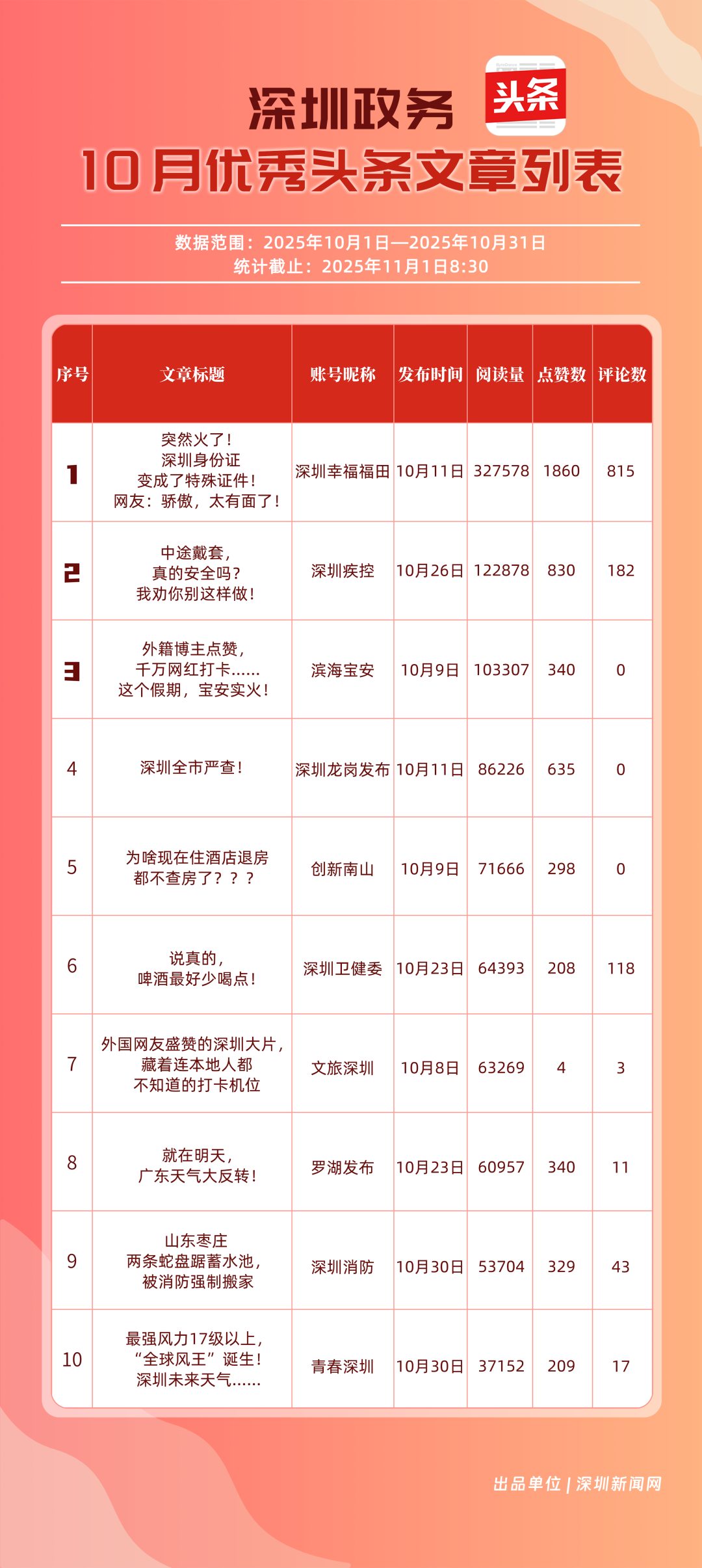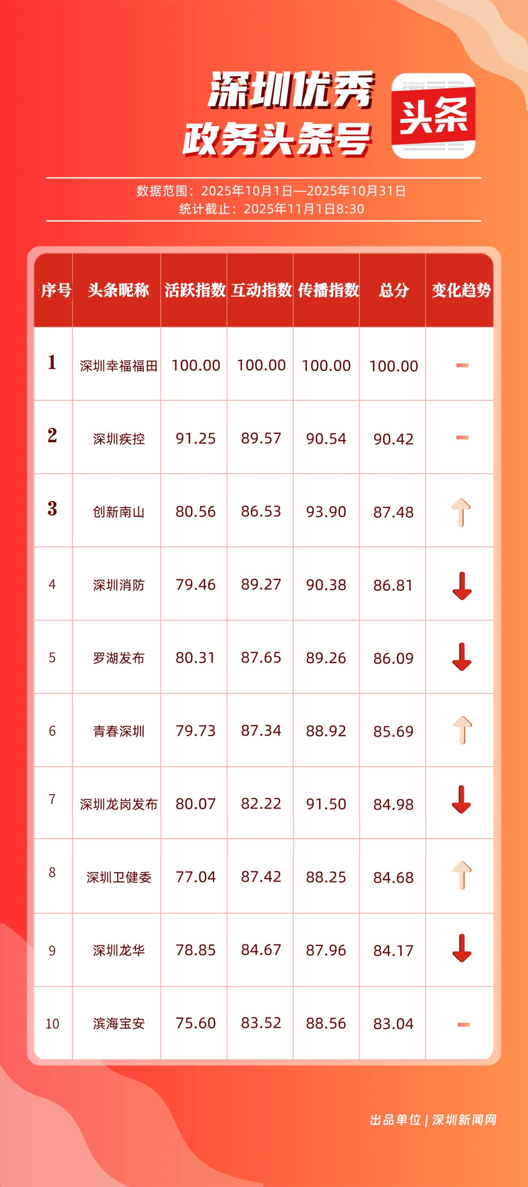 10月,“深圳幸福福田”“深圳疾控”“創(chuàng)新南山”“深圳消防”“羅湖發(fā)布”“青春深圳”“深圳龍崗發(fā)布”“深圳衛(wèi)健委”“深圳龍華”“濱海寶安”共10個政務(wù)頭條號入選“優(yōu)秀政務(wù)頭條號”榜單?!吧钲谛腋8L铩痹诨钴S、互動、傳播均收獲較好成果,蟬聯(lián)榜首;“深圳疾控”得分超90分,持續(xù)發(fā)布民生健康類內(nèi)容,為市民健康保駕護(hù)航;“創(chuàng)新南山”內(nèi)容創(chuàng)作緊扣民生與區(qū)域特色,位列榜單第三名?!吧钲谙馈薄傲_湖發(fā)布”等賬號也位列榜單前列,成為區(qū)域政務(wù)新媒體內(nèi)容創(chuàng)新、信息傳遞的標(biāo)桿。