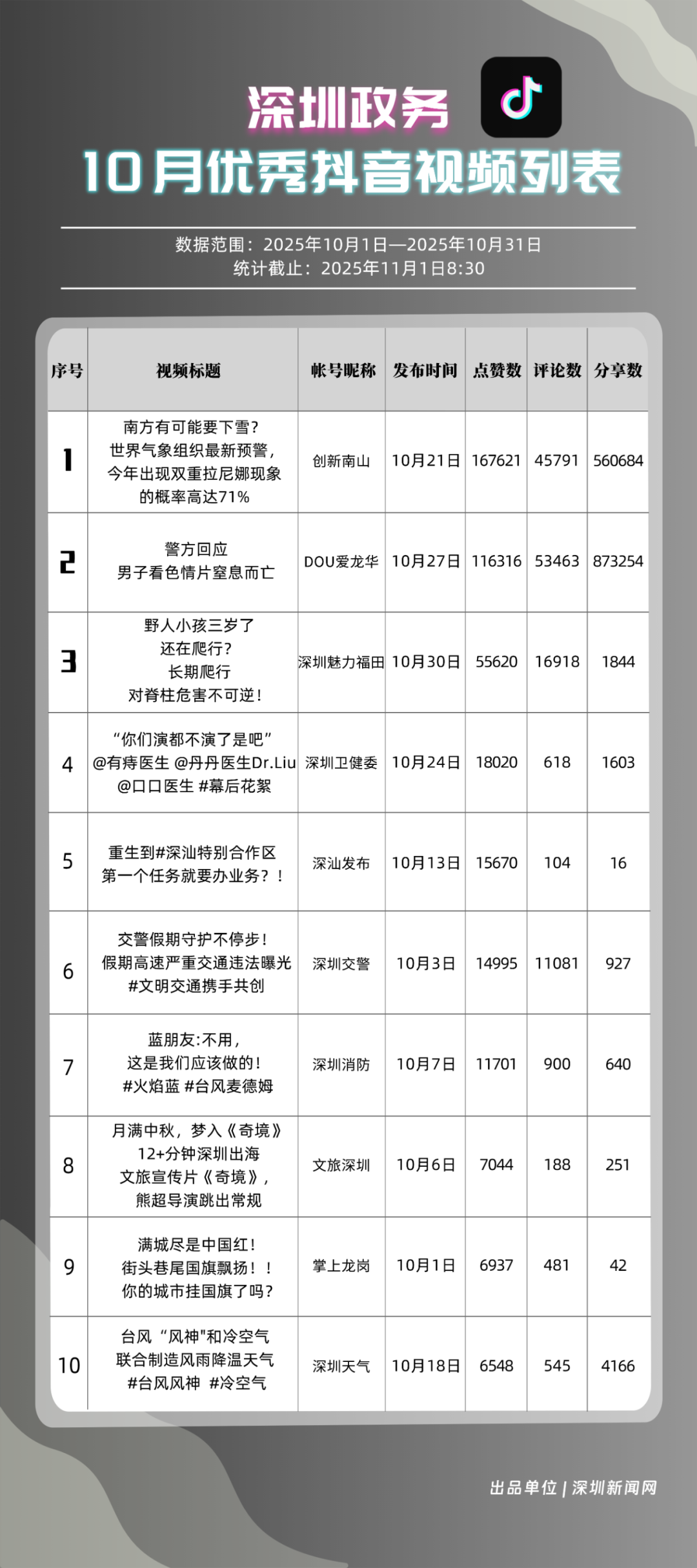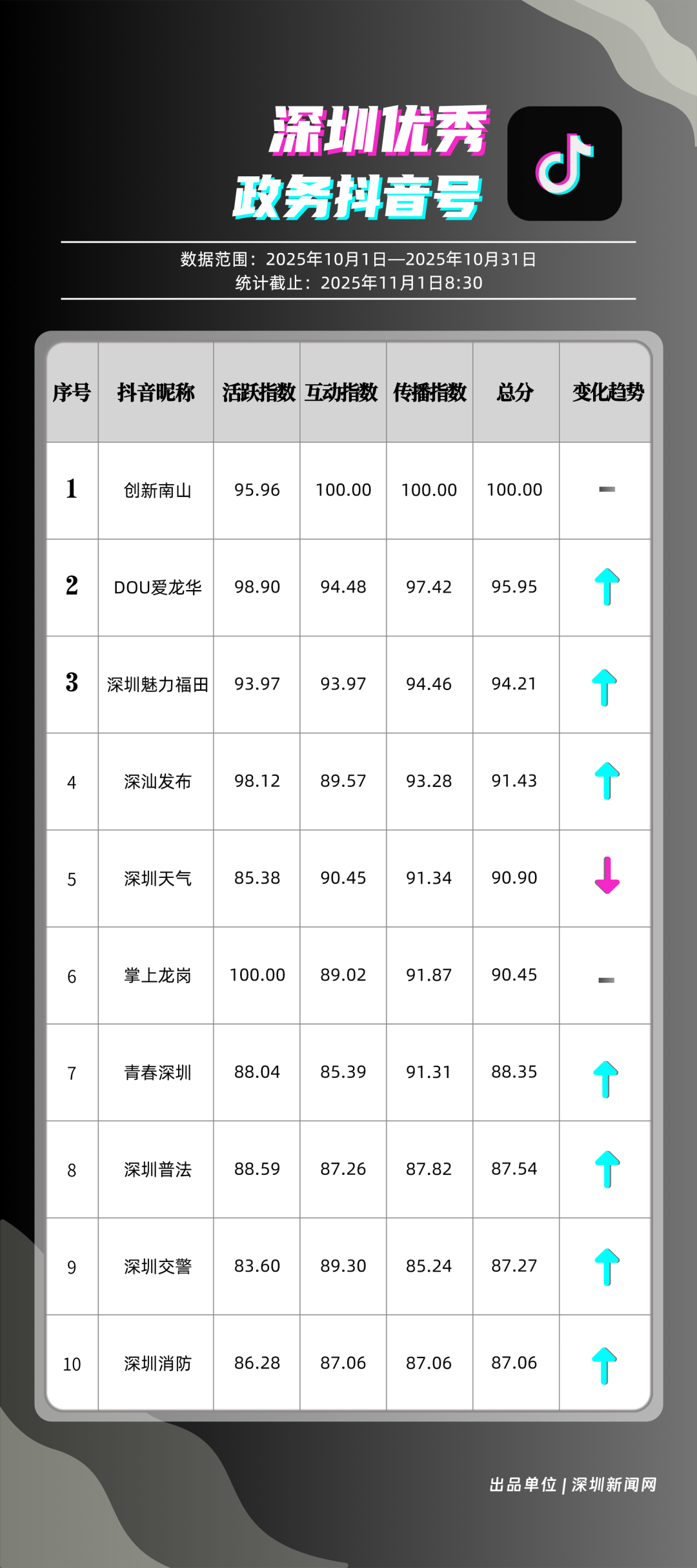 10月,獲得“優(yōu)秀政務(wù)抖音號”稱號的是“創(chuàng)新南山”“DOU愛龍華”“深圳魅力福田”“深汕發(fā)布”“深圳天氣”“掌上龍崗”“青春深圳”“深圳普法”“深圳交警”“深圳消防”?!皠?chuàng)新南山”以總分100分居于榜首,展現(xiàn)出其內(nèi)容創(chuàng)作對用戶的強(qiáng)大吸引力與傳播力;“DOU愛龍華”與“深圳魅力福田”分別位列第二、三位,得分在95分左右,排名較上期有所上升?!吧钌前l(fā)布”“深圳天氣”“掌上龍崗”等賬號得分均在90分以上,以年輕化表達(dá)展示實用信息,也收獲較好互動、傳播成績。