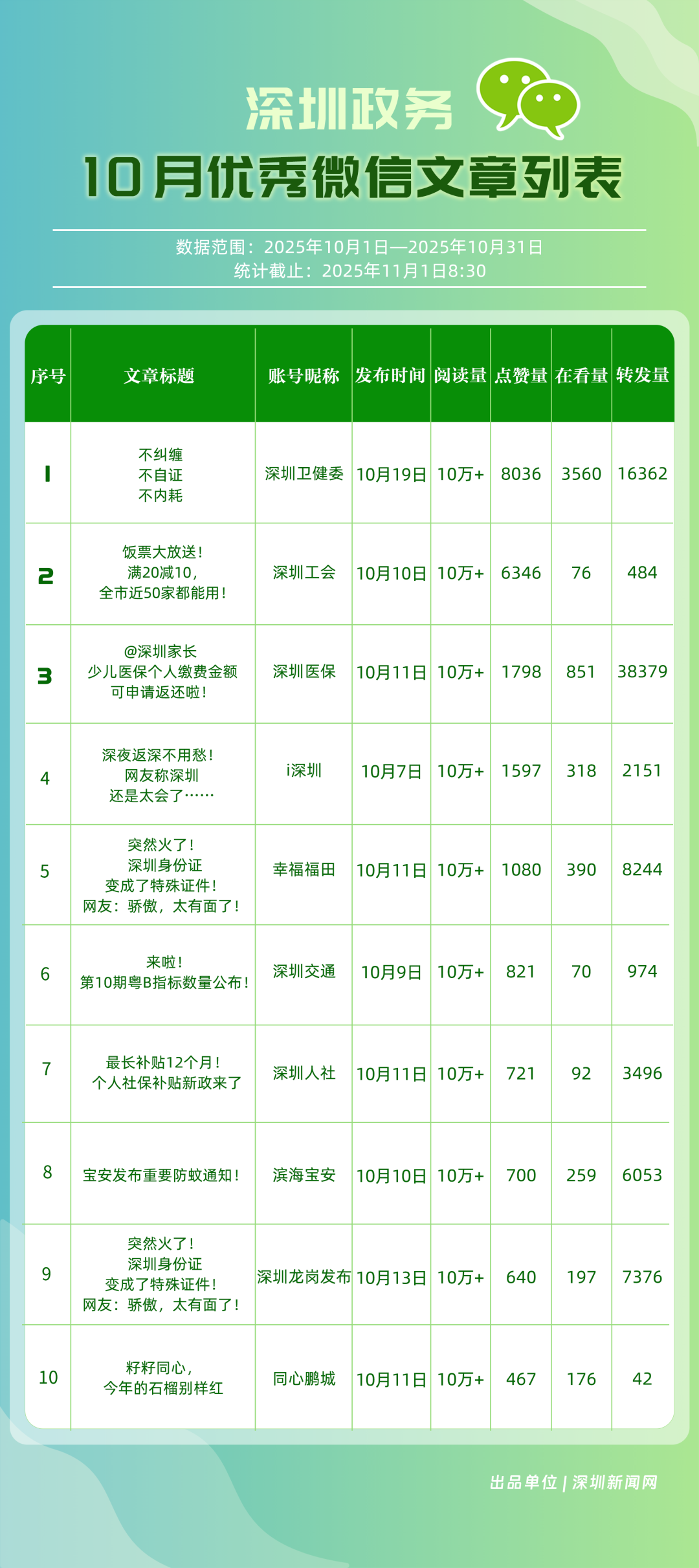 10月,“深圳衛(wèi)健委”“深圳龍崗發(fā)布”“i深圳”“幸福福田”“深圳工會”“青春深圳”“創(chuàng)新南山”“濱海寶安”“深圳龍華”“深圳光明”等30個政務(wù)微信公眾號榮登“深圳優(yōu)秀政務(wù)微信公眾號”榜單。10月,“深圳衛(wèi)健委”以總分100位居榜首,其持續(xù)以真誠、反套路的內(nèi)容,將專業(yè)健康知識轉(zhuǎn)化為網(wǎng)民喜聞樂見的“生活指南”,受到大量網(wǎng)民喜愛;“深圳龍崗發(fā)布”位居第二,持續(xù)發(fā)布高質(zhì)量內(nèi)容,成為市民獲取龍崗動態(tài)的“第一窗口”;“i深圳”也發(fā)布政策、民生內(nèi)容,排名有所上升,位列第三;“幸福福田”“深圳工會”等也立足區(qū)域特色,通過多元內(nèi)容,展現(xiàn)各自的發(fā)展活力。