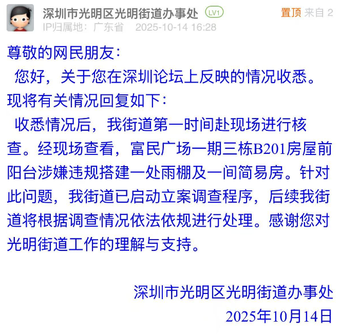 在本帖文中,街道辦的回應(yīng)說(shuō)明建筑涉嫌違規(guī)搭建,已啟動(dòng)立案調(diào)查程序,但后續(xù)網(wǎng)民留言表示,已在2022年4月起向12345投訴相關(guān)情況,仍未處理好,對(duì)相關(guān)部門(mén)的處理情況產(chǎn)生質(zhì)疑。對(duì)此類長(zhǎng)期投訴的回應(yīng),建議適當(dāng)說(shuō)明未能及時(shí)處理完結(jié)的客觀原因,如歷史遺留問(wèn)題復(fù)雜、處置涉及多部門(mén)協(xié)調(diào)或相關(guān)認(rèn)定流程較為復(fù)雜等,并盡量明確“預(yù)計(jì)處理時(shí)限”,回應(yīng)市民對(duì)“依法履職”的期待。