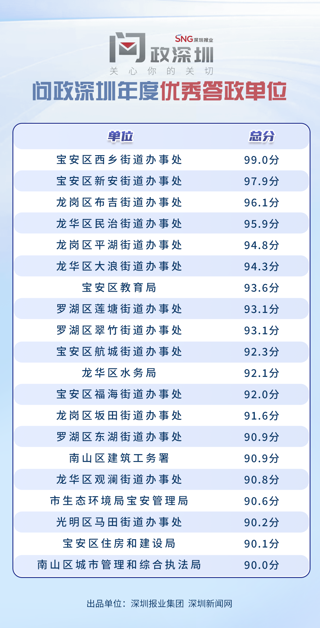 本次年度名單基于2025年1—12月“問政深圳紅黑榜”各期公開數(shù)據(jù)進行匯總統(tǒng)計。評價體系沿用月度評分標準,圍繞答政量、回應率、響應時效、解決成效四項一級指標進行綜合測算。