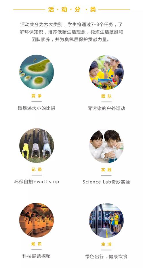 1.在一天時(shí)間內(nèi)挑戰(zhàn)“臭氧英雄·低碳足跡”國際主題活動(dòng),學(xué)習(xí)低碳生活技能,感受中英雙語課堂;