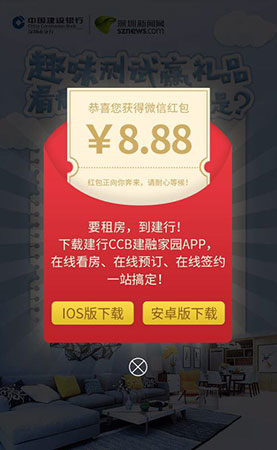 5、當?shù)梅殖^ 300 分時,即有機會獲得由建設(shè)銀行提供的微信現(xiàn)金紅包一份,活動期間,每位用戶僅限領(lǐng)取一次。