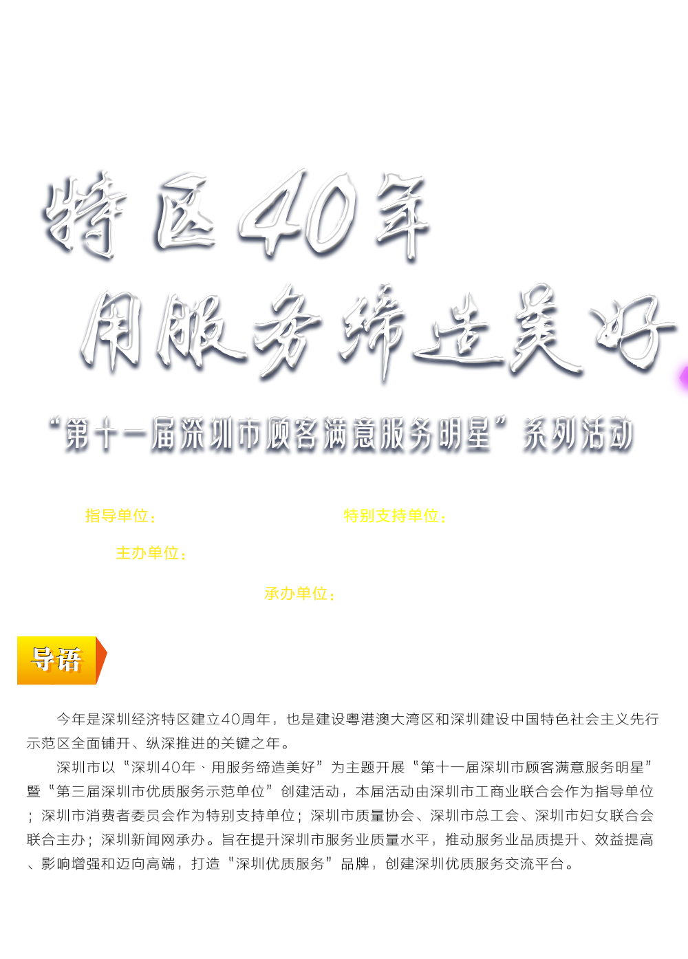 第十一屆顧客滿意服務(wù)明星活動(dòng)現(xiàn)場(chǎng)深圳市政協(xié)常委、深圳市質(zhì)量協(xié)會(huì)執(zhí)行會(huì)長(zhǎng)李榕致辭200余人參加第十一屆顧客滿意服務(wù)明星活動(dòng)頒獎(jiǎng)典禮深圳機(jī)場(chǎng)、深圳燃?xì)?、華夏銀行深圳分行榮獲“優(yōu)質(zhì)服務(wù)示范單位”稱號(hào)廣東省深圳市深圳公證處等22家單位獲得“顧客滿意服務(wù)明星單位”稱號(hào)陳傳龍、陳繁華等10位同志獲得“第十一屆深圳市顧客滿意服務(wù)杰出管理者”稱號(hào)“生命之星”班組等50個(gè)團(tuán)隊(duì)獲得“明星團(tuán)隊(duì)”稱號(hào)陳華等70位同志獲得“第十一屆深圳市顧客滿意服務(wù)明星(個(gè)人)”稱號(hào)