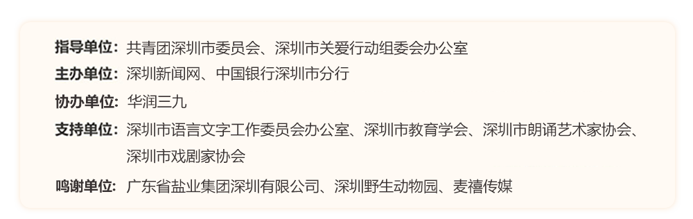 為助力建設(shè)良好的青少年閱讀環(huán)境,激發(fā)學(xué)生閱讀興趣,倡導(dǎo)親子閱讀,共建和諧家庭關(guān)系。2022年,“誰(shuí)是故事大王·第六季”在共青團(tuán)深圳市委員會(huì)、深圳市關(guān)愛(ài)行動(dòng)組委會(huì)辦公室的指導(dǎo)下再出發(fā)。活動(dòng)由深圳新聞網(wǎng)、中國(guó)銀行深圳市分行主辦,華潤(rùn)三九協(xié)辦,得到了廣東省鹽業(yè)集團(tuán)深圳有限公司、深圳野生動(dòng)物園、麥禧傳媒的大力支持。更長(zhǎng)的活動(dòng)周期,更豐富的參與形式,更專(zhuān)業(yè)的賽制,等你來(lái)解鎖與挑戰(zhàn)!讓閱讀成為最動(dòng)人的風(fēng)景,讓故事的魅力感動(dòng)深圳。說(shuō)明:所有參賽者報(bào)名成功后,均承認(rèn)并允許主辦方將個(gè)人參加本次活動(dòng)的照片或視頻相關(guān)資料刊發(fā)在各類(lèi)媒體雜志報(bào)紙上,用于活動(dòng)宣傳。